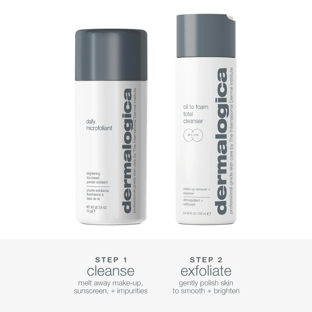 Slightly dampen face. Massage Oil to Foam Total Cleanser over face and eyes to dissolve surface oil and dirt. Wet hands and continue massaging to create a foam to wash away make-up, sebum, and sunscreen. Rinse with warm water. Dispense about a half-teaspoon of Daily Microfoliant into very wet hands and create a creamy paste by rubbing hands together. Apply to face in circular motions, avoiding the eye area. Massage gently for one minute, then rinse thoroughly.