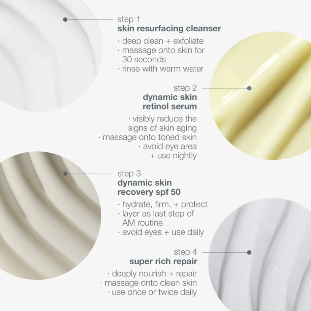 Lather Skin Resurfacing Cleanser and massage onto damp face and neck for at least 30 seconds. Avoid eye area. Rinse thoroughly. After cleansing, apply a thin layer of Dynamic Skin Retinol Serum over face. Keep out of eyes. Use nightly. If dryness or redness occurs, reduce frequency. Follow with Super Rich Repair and apply to face and neck with light, upward strokes. Wait for cream to absorb before applying additional products. Wear Dynamic Skin Recovery SPF50 during the day and apply generously to face 15 minutes prior to sun exposure.